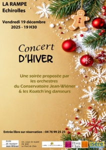 Vendredi 19 décembre 2025 à 19h30 à la RAMPE d’Echirolles, aura lieu la traditionnelle soirée des orchestres du conservatoire Jean-Wiéner. Au programme des pièces variées qui vous emmeneront dans l’univers festif des fêtes de fin d’année.