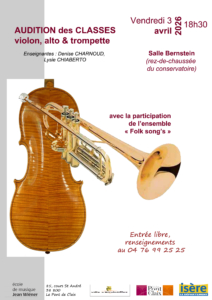 Sous différentes formations, des élèves trompettistes, violonistes et altistes partageront un joli moment de musique. L’ensemble Folk song’s sera également de la partie avec un programme de musique traditionnelle.