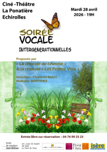 Mardi 28 avril à 19h au Ciné Théâtre LA PONATIERE à Echirolles aura lieu une soirée intergénérationnelle où « Les petites Voix  » et « La chorale de l’Amitié » partagent la scène.